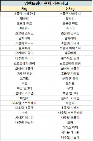 기준 임팩트웨이 주문 가능한 맛 LIST -